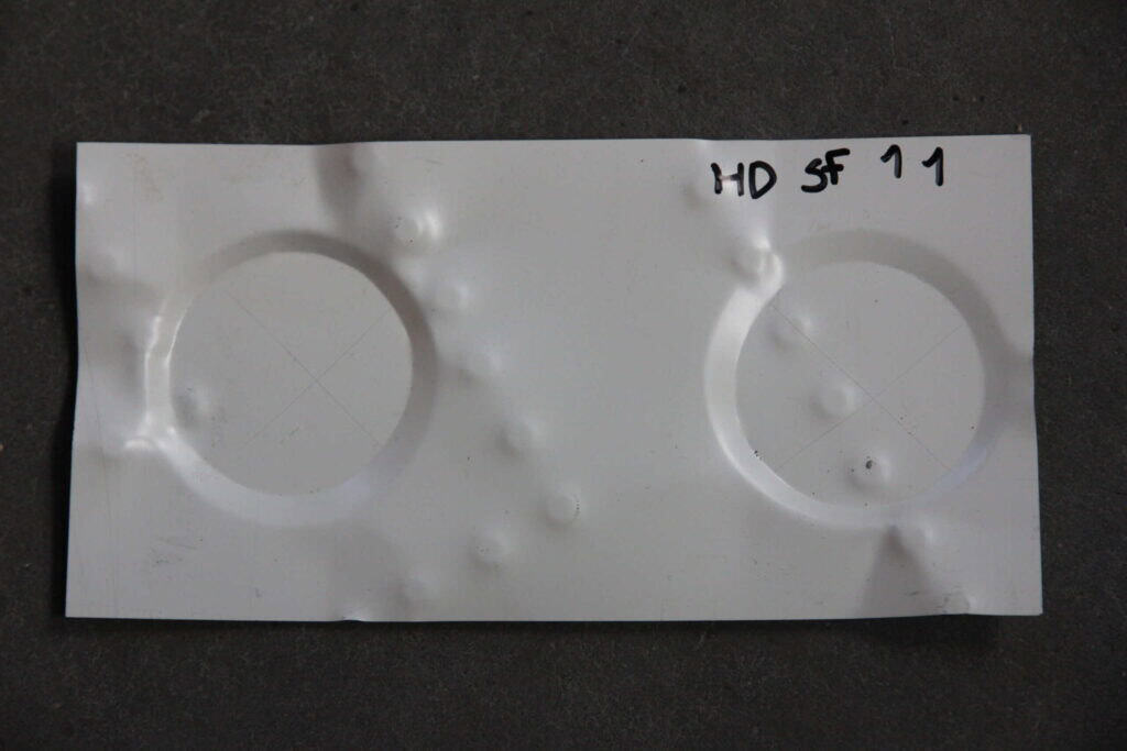Die Proben der verschiedenen Materialoptionen wurden verschiedenen Reinigungs- und Desinfektionsmitteln ausgesetzt. Die Tests wurden unter realistischen Bedingungen durchgeführt, wobei die Proben absichtlich verformt und zerkratzt wurden.