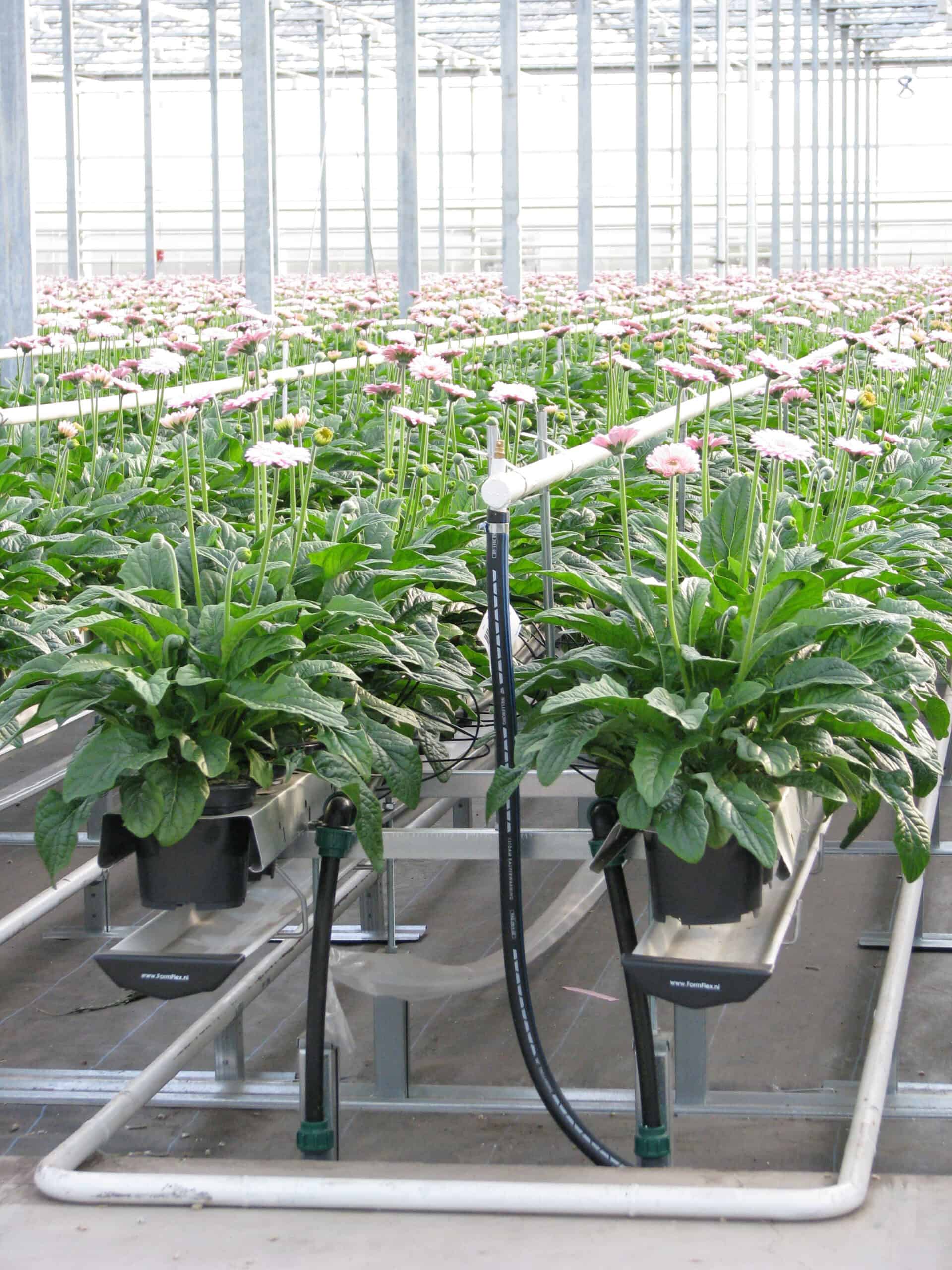 Metazet hat die FormFlex® VG Kulturrinne zusammen mit einem Gerbera-Züchter entwickelt, um den Gewächshausboden und die Laufwege trocken zu halten. Inzwischen wird diese Entwässerungsrinne auch im Stellagenanbau und in Kombination mit der FormFlex® PG Rinne in Topfrinnensystemen eingesetzt.